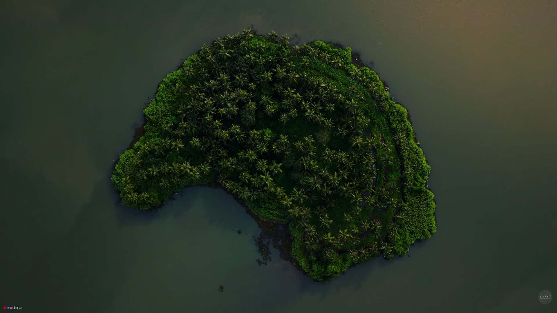 A picturesque view of a small island in the middle of the backwaters, adorned with vibrant greenery and a solitary palm tree, reflecting the untouched beauty of Kerala's waterways.